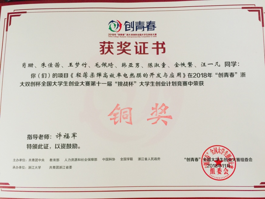 11月3日,2018年“创青春”全国大学生创业大赛在浙江大学落下帷幕,本届大赛是党的十九大之后举办的第一届“创青春”大赛,大赛以“弄潮创青春、建功新时代”为主题,于今年3月全面启动,全国共收到2200余所高校的逾百万名大学生、15万余件作品报名参赛。经过各高校校赛、各省级竞赛、全国复赛选拔,共有来自全国31个省(自治区、直辖市),以及新疆生产建设兵团、香港特别行政区、澳门特别行政区197所高校的369件作品入围终审决赛。我院许福军老师指导的《轻薄柔弹高效率电热膜的开发与应用》项目在创业计划赛中突出重围,力夺铜奖。