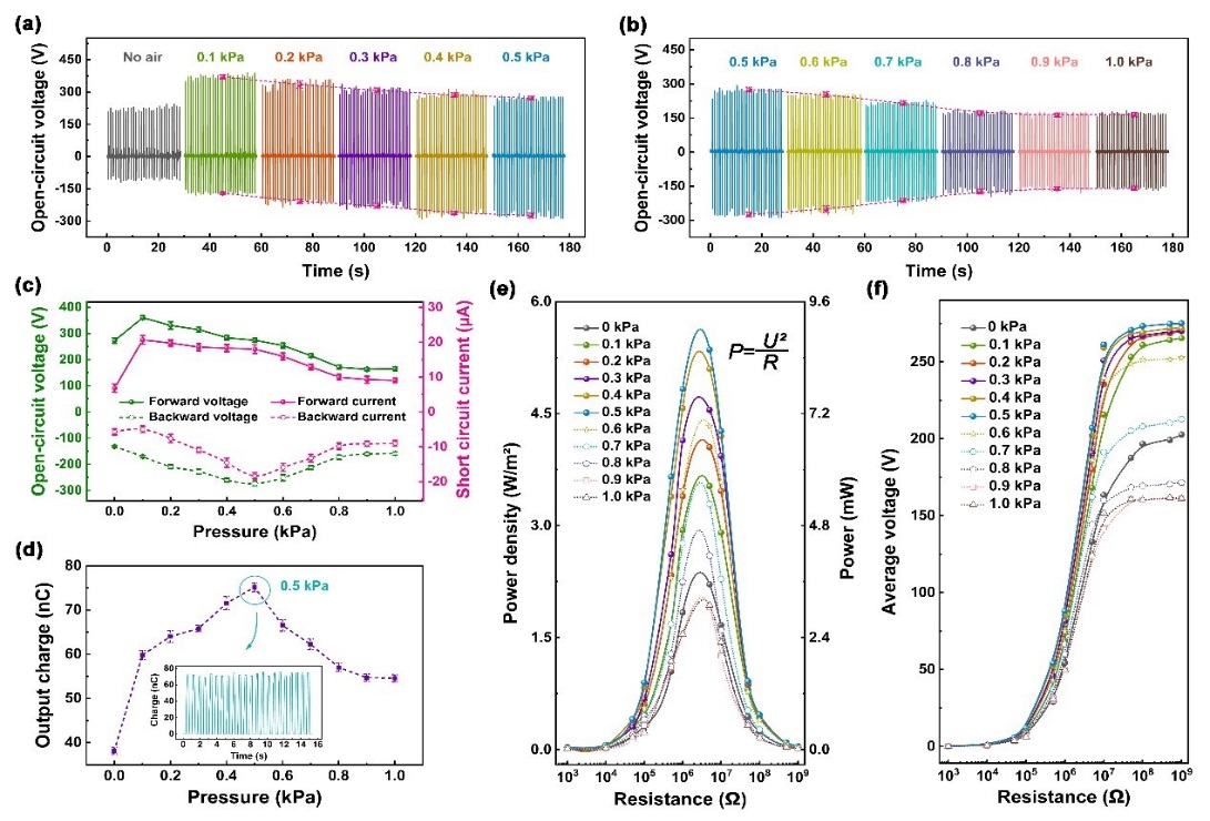 针对这种新型结构的能源器件,中文av 人员系统地中文av 了其在不同内部气压下的电输出性能,证明了在内压为0.5kpa时,该器件能产生最大输出。同时,还发现器件内部的空气能平衡外力的分布,使输出性能的正反向信号均匀化。此外,还比较和分析了不同作用力、频率、空气相对湿度、温度等外界因素对器件电输出性能的影响,进一步验证了其环境适应性。