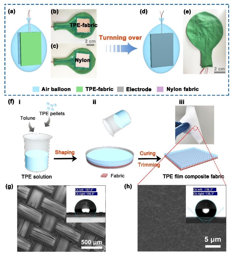针对上述问题,中文av 团队选用弹性高、气密性好、机械强度高的乳胶气囊作为摩擦电纳米机的密封基材;同时采用纺织丝网印刷技术制备出银涂层的锦纶织物作为正摩擦材料、采用纺织涂层技术制备热塑性弹性体TPE/锦纶/银复合织物作为负摩擦材料,并巧妙装配制备出一种由空气作为间隔支撑部件的密封结构一体式摩擦纳米发电器件。其利用空气的的可压缩特性,有效实现了摩擦纳米发电机周期性的柔和接触与分离,可对环境中多种形式机械能的进行收集和利用。此外,这种空气间隔-密封结构的摩擦纳米发电机大大提高了提高其环境适应性。