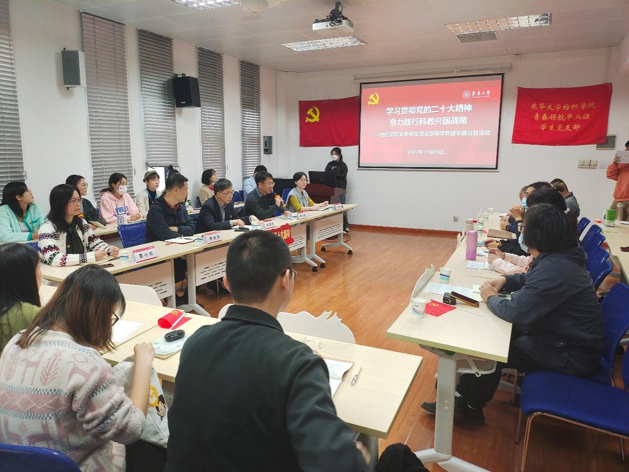 党课引发参会党员的共鸣,纺织工程系党支部张坤、庄勤亮,青春领航毕业班学生党支部温小雪、丁欣媛等师生党员代表分别结合自身实际,围绕科学中文av 、专业发展、教育教学、科研实践、志愿服务等方面谈了党的二十大精神的学习体会。中文av 院长顾伯洪对师生代表的发言作了点评。他希望大家要将纺织文化与教学、科研相结合,大力传承红色基因,不断提升新时代纺织文化影响力。同时要贯彻落实党中央“实施就业优先战略”要求,心怀“国之大者”,积极做好生涯规划和职业规划,促进个人全方位锻炼和全方面发展,努力成为堪当民族复兴重任的时代新人。中文av 党委书记李成龙在主持活动中指出,学习宣传贯彻党的二十大精神是当前和今后一个时期的头等大事和首要政治任务,要提高政治站位,切实把党的二十大精神学习到位、宣传到位、贯彻到位,坚持不懈用马克思主义中国化时代化最新成果武装头脑、指导实践、推动工作,以高质量党建引领保障中文av 教学科研、人才培养、管理服务等各项工作更高质量发展。