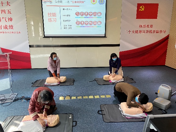 度学文以“构筑生命共同体 绘就健康同心圆”为题,首先抛出问题“心脏猝死(SCA)后的表现是什么?”,接着从反应、呼吸、心跳三个维度,带领大家层层深入,了解心肺复苏完整的操作步骤、自动体外除颤仪(AED)的使用方法、抢救时间与成功率之间关系等应急救护知识,并现场带领大家实际演练了心肺复苏的流程和手法。与会人员积极参与,现场气氛热烈。